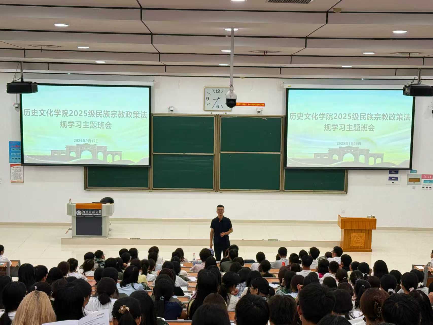 9月15日下午,历史文化学院于文昌楼302教室召开民族宗教法规学习活动,2025级全体本科生参加,活动由学院辅导员庞振康主持。