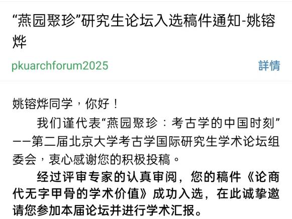 姚镕烨的论文聚焦商代无字甲骨,对其多方面的学术价值展开了深入剖析。该文章经过论坛的严格评审,从众多投稿中脱颖而出,获选为会议报告论文。