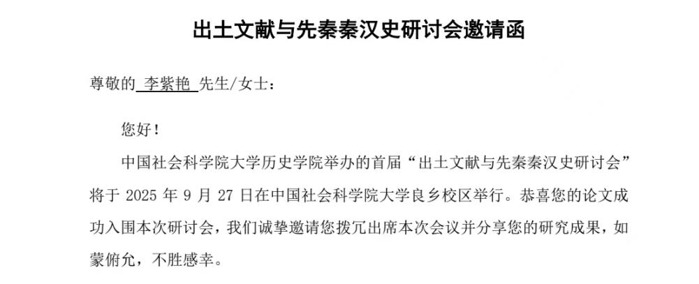 近日,中国社会科学院大学历史学院公布了“出土文献与先秦秦汉史研讨会”入选名单,我院2023级硕士研究生李紫艳所撰写的《方法敛的甲骨文辨伪成就》一文成功获选。本次研讨会将于2025年9月27日在北京举行,旨在弘扬“以古文字材料探究先秦秦汉社会”的学术传统,继承顾颉刚、胡厚宣、张政烺、林甘泉、李学勤、谢桂华等前辈学者的优良学风。