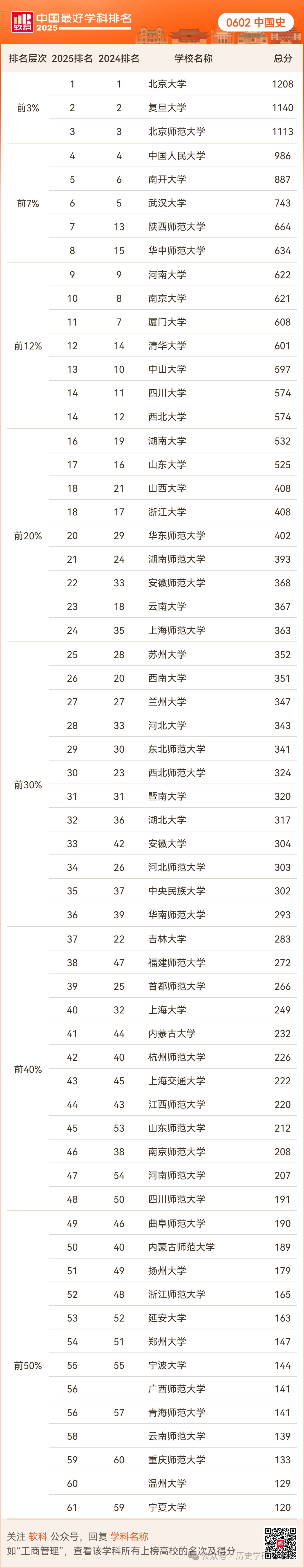 据历史学研究通讯报道,2025年10月15日,高等教育评价专业机构软科正式发布“2025软科中国最好学科排名”。软科中国最好学科排名(一级学科)指标体系包括人才培养、平台项目、成果获奖、学术论文、高端人才5个指标类别,下设19个指标,共计200多项反映学科竞争力的观测变量。我院中国史学科获评207分,排名第47位,较去年前进7位,历史上首次进入40%行列。