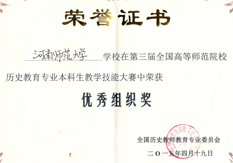 2015年4月17至19日,第三届全国高等师范院校历史教育专业本科生教学技能大赛在西南大学举行。我院选派3名学生参加了此次大赛,在牛琳、马小能老师的悉心指导下,经过激烈角逐,2人获得二等奖、1人获得三等奖,其中2011级历史学专业胡东逸、2012级历史学专业娄钰晗分别获得说课二等奖,2012级历史学专业宗尧获得讲课三等奖,我校获得优秀组织奖,马小能老师获得优秀辅导教师奖。院党委书记王霞、副院长鞠明库带队并观摩了此次大赛。