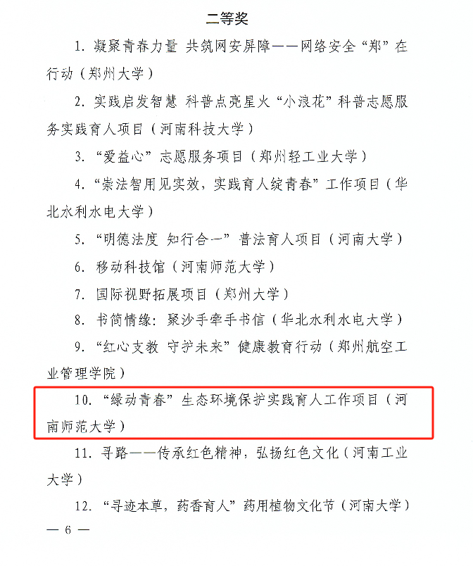 本次大赛按照以赛促学、以学促干、以干促进的思路,结合高校团学组织改革向纵深发展的工作重点,开展了实践育人工作项目大赛、“我为同学做实事”项目大赛、微团课大赛、活力社团大赛四项赛事。据悉,大赛自今年9月启动以来,全省百余所高校的1279个项目参与其中,经前期复赛评审,共有62个实践育人工作项目、63个微团课、65个团支部和106个社团入围终审决赛。其中,我院团委书记岳云鹏经过现场汇报展示与评委答辩等环节的激烈角逐,“绿动青春”生态环境保护实践育人工作项目获得省级二等奖。近五年,我院团委培育的工作项目三次参赛,分别揽获一、二、三等奖,取得了显著的育人实效。