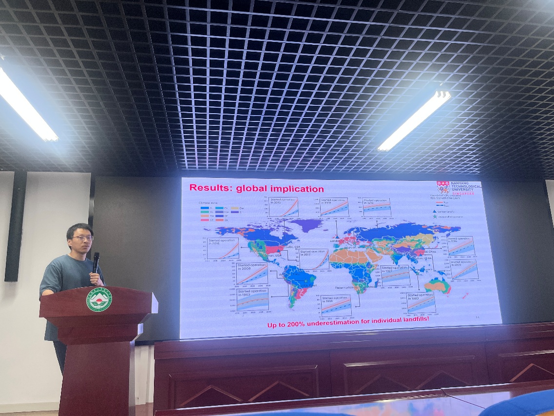 费璕瑺教授以其课题组在《Nature Sustainability》上发表的最新研究成果为例展开讲解。费教授从生活垃圾这一常见废弃物引入故事,站在全球视野介绍了目前IPCC推荐的估算垃圾填埋场甲烷排放的一阶衰减模型,深入浅出的为大家讲解了主流使用的IPCC推荐的甲烷排放评估模型存在的偏差。于是专门针对垃圾组分和环境条件等因子修正了原有模型中速率控制参数k的估算方法,发现修正k值后计算的甲烷排放量的准确性显著提高。将修正后的排放量估算方法扩展到全球垃圾填埋场,发现当前主流使用的IPCC方法估算的甲烷排放量明显偏低,个别场地的低估量可达200 %,新修正的模型和基于全球视野的验证性评估有望为全球垃圾填埋场的甲烷排放评估提供新的标准。报告最后,费璕瑺教授勉励学生们做科研要扎实深入领域学习,以全球视野认真思考,发现问题,打破常规。报告结束后,费璕瑺教授与我院师生进行热烈的讨论和交流。