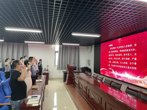 随后,学院进行了新进教师入职宣誓暨教职工重温誓词活动,曹治国带领全体教师宣读了《河南教师誓词》。