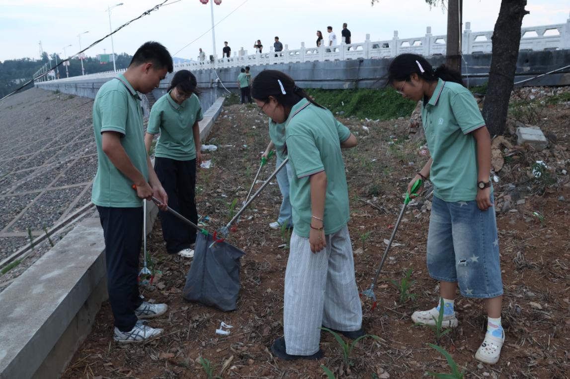 紧接着,一场“守护河湖清流”的志愿行动在水库沿岸展开。实践团成员化身“河湖卫士”,沿预定巡护路线细致排查,对散落在岸边、草丛中的各类垃圾进行地毯式清理。从废弃的塑料包装袋、渔网等大件废弃物,到隐蔽的烟头、食品包装碎片等细小垃圾,都被同学们一丝不苟地拾起并分类装袋。指导教师岳云鹏在现场动情地说:“头顶骄阳似火,难掩护河热忱。作为环境学子,要从自身做起,坚持绿色低碳生活,积极参与志愿活动,用实际行动擦亮生态文明建设的青春底色!”