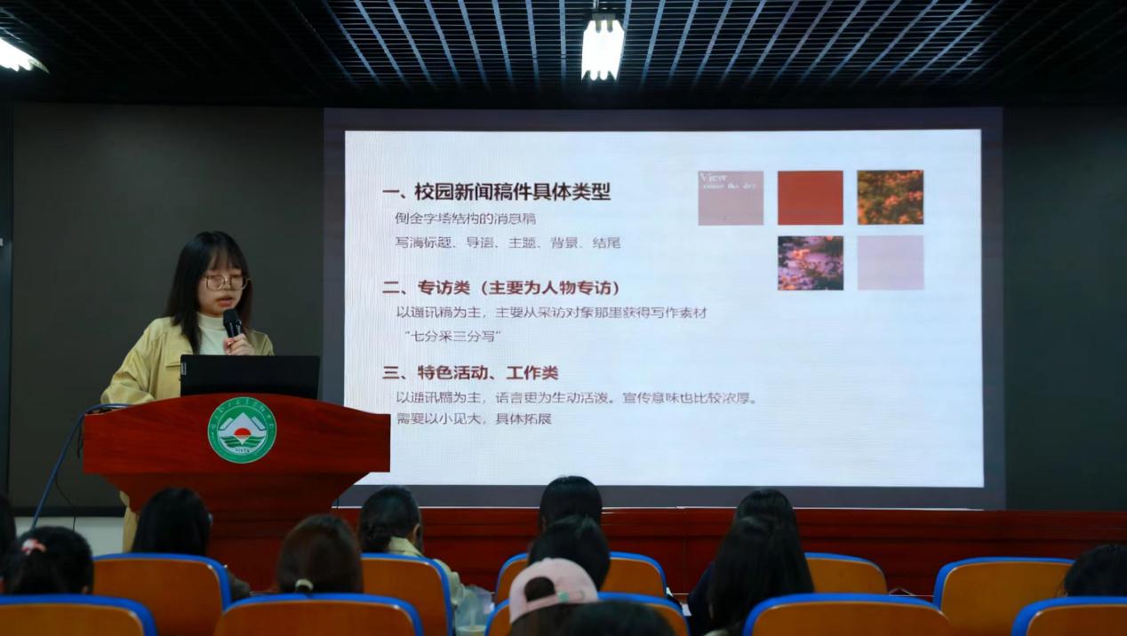 11月1日下午,我院团委、学生会在实训楼1509报告厅举办宣传写作能力提升专题培训会。团委学生会全体成员及2025级志愿者参与培训,本次培训由大学生记者张紫茹主讲。