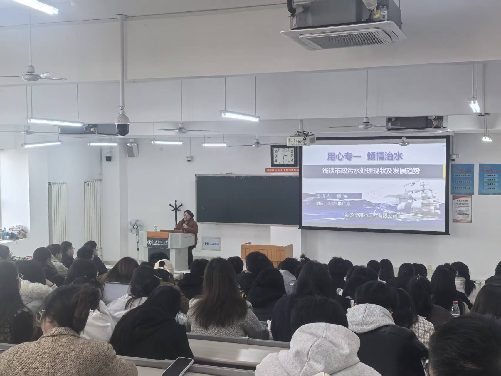 杨波高级工程师围绕市政污水处理发展史及行业现状、竞争格局、发展趋势三大核心板块展开,结合新乡市本地污水处理实际情况,系统介绍了污水处理核心工艺及主要构筑物特性。她还分享了污水处理从业人员的日常工作场景,让师生直观了解行业实操流程。报告内容兼具理论深度与实践指导性,既解读了行业政策导向,又通过具体工程案例剖析了实际运行中的关键问题与解决方案,逻辑严密、案例详实。互动环节中,师生们结合自身教学、科研及学习中的疑问积极提问,杨波高级工程师逐一耐心解答,针对专业学习、工程实践及职业发展等方面给出具体建议。现场交流氛围热烈,大家纷纷表示,报告不仅加深了对市政污水处理行业的认知,也为专业学习和科研工作提供了新思路、新视角。