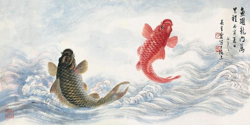 吴青霞 0051 丙寅(1986)年作 鱼跃龙门 镜片 设色纸本(图源网络)