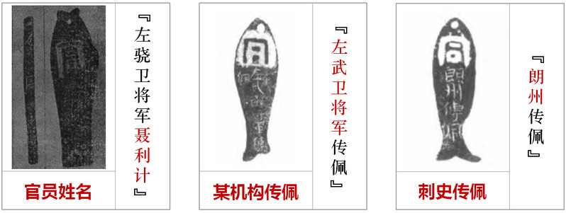 在随身鱼符上,有的会刻官员的官职、机构或姓名。例如“左骁卫将军聂利计”([苏]Э·В·沙夫库诺夫《苏联尼古拉耶夫斯克遗址出土鱼形青铜信符》),“左、右骁卫”是皇帝的护卫部队,聂利计即持该鱼符的官员。如果是同一机构的官员也可不刻姓名,只需刻官职名称“传佩相付”即可,如刻左武卫将军传佩,“朗州传佩”或者“同州刺史传佩”,为各州刺史传递着佩戴。