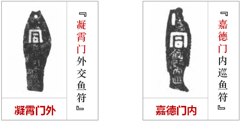 这种鱼符左符在宫内,右符监门的长官拿着,如下图凝霄门和嘉德门的鱼符。