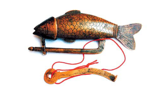 元陆友仁在《研北杂志》中记载:“故宋宫中用鱼钥,降鱼取匙,降匙而鱼,古制也。”钥匙做成鱼形就可保安全,显然是一种愿望,但古人这样做,倒也不乏警示之意,提醒大家关门要上锁,不要被偷。由此还形成一种年俗,古人过年时会将一盘鱼放在正对大门的供桌上,取的就是“鱼不瞑目”之义,希望鱼神看护家门,防鬼怪进来,这里的“鱼”又有镇宅的作用。
