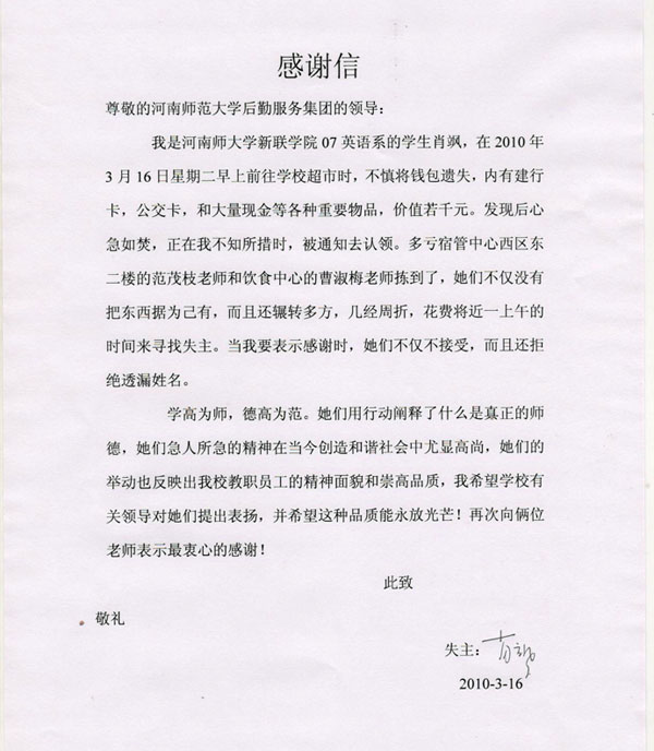 接过丢失的钱包,肖飒万分感动,对两位后勤职工表示了深深谢意。激动之余拨通母亲的电话,高兴地告诉她:“钱包找到了,钱包找到了。”失主的母亲说:“还是后勤职工好!”