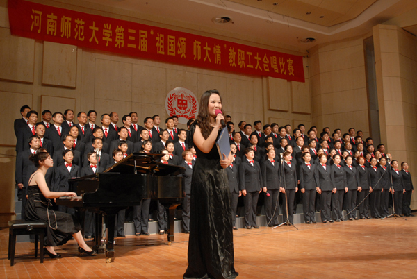 集团代表队排于第20位出场,演唱的是《校歌》和《东方红》,随着伴奏音乐声,全体队员在韩婧老师的指挥下,激昂慷慨,把歌曲演绎的铿锵有力,把爱国荣校的豪情表达的淋漓尽致,深深感染了在场的评委和观众。两曲结束,全场掌声不断,集团代表队以饱满的热情、高昂的状态、优美的声音展现了集团职工积极向上、团结进取的良好精神风貌,赢得了在场评委和观众的一致好评。比赛结束后,校党委书记书记张亚伟为集团颁发了一等奖奖牌。