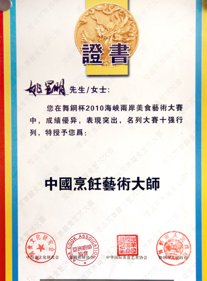 近日,由亚洲厨师协会、中华国际美食艺术协会、中国食文化市研究会主办的2010年海峡两岸美食艺术大赛暨经贸洽谈在舞钢市举行。我校后勤集团沁园宾馆厨师长姚显明凭借精湛的厨艺,在来自台湾、香港以及大陆各地区的200余名烹饪选手中脱颖而出,获得大赛最高奖项特金奖和“中国烹饪艺术大师”荣誉称号。
