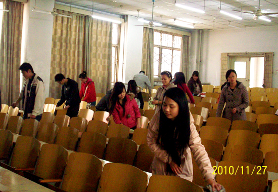 11月27日中午,我校文学院2010级入党积极分子与后勤集团宿管中心联合在文科楼开展了义务清扫教室的实践活动。