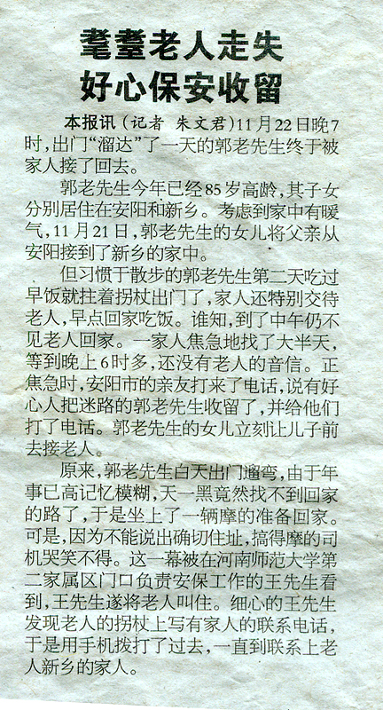 但习惯于散步的郭老先生第二天吃过早饭就拄着拐杖出门了,家人还特别交代老人,早点回家吃饭。谁知,到了中午仍不见老人回家。一家人焦急地找了大半天,等到晚上6时多,还没有老人的音信。正焦急时,安阳市的亲友打来了电话,说有好心人把迷路的郭老先生收留了,并给他们打了电话。郭老先生的女儿立刻让儿子前去接老人。