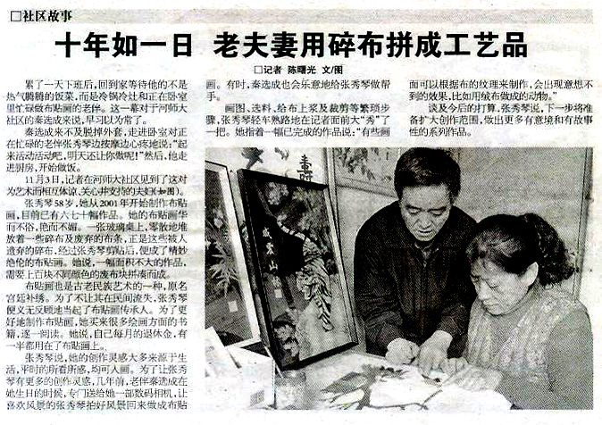 张秀琴58岁,她从2001年开始制作布贴画,目前已有六七十幅作品。她的布贴画华而不俗,艳而不媚。一张玻璃桌子上,零散地堆放着一些碎布及废弃的布条,正是这些被人遗弃的碎布,经过张秀琴剪贴后,便成了精妙绝伦的布贴画。她说,一幅面积不大的作品,需要上百块不同颜色的废布块拼凑而成。