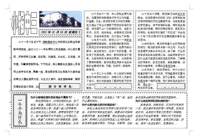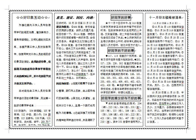 日前,中三楼管理员推出管理新举措,以“中三小报”的形式对楼管工作进行宣传并及时与学生进行沟通,“小报”内容丰富、翔实,涵盖了楼内好人好事、存在问题、维修报修、安全防范意识教育、违障电器的危害性、同学们的意见和建议等,真正做到了“宿舍是我家,管理靠大家”。小报的编者是楼管员范晓东,长期坚持文学创作,出有文学专著;在宿舍楼管理中,经常把一些重要通知和注意事项变成琅琅上口的诗歌写在小黑板上,深受学生欢迎。