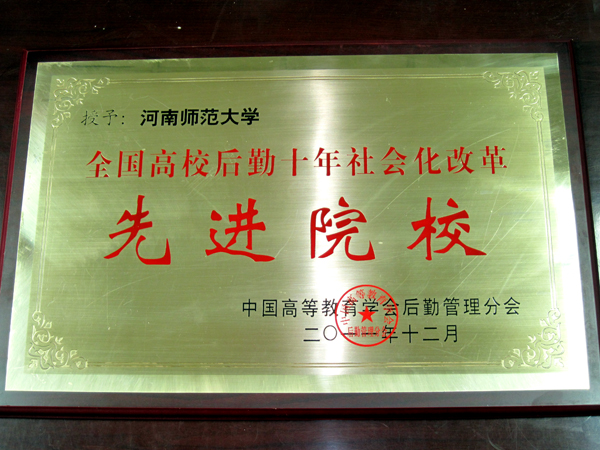 此荣誉旨在表彰在高校后勤社会化改革十年的发展历程中涌现出的锐意进取、求真务实、成绩突出的先进院校,经河南省教育厅推荐,中国高等教育学会后勤管理分会十届二次理事会讨论通过,并报教育部主管部门批准,同意授予我校“全国高校后勤十年社会化改革先进院校”荣誉称号。