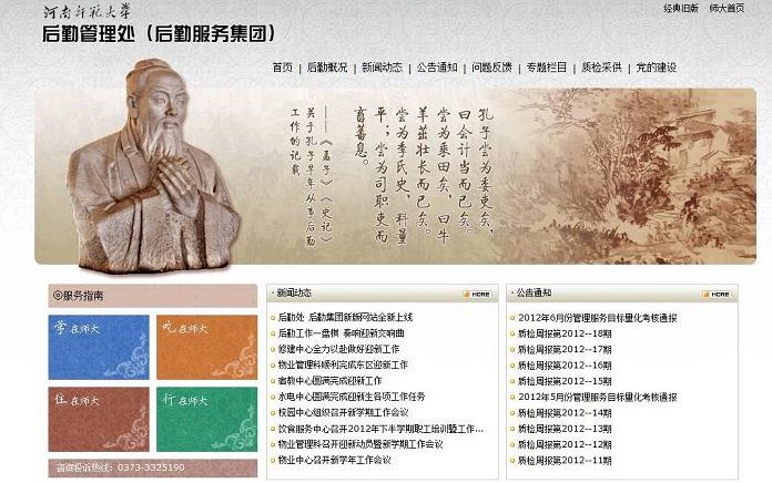 首页设计构思主题是“万世师表 后勤楷模”,取自孔子早年从事后勤工作的典故,突出师范特色和后勤特色,画面采用文科楼孔子像和《孟子》、《史记孔子世家》中关于孔子从事后勤工作的记载,孔子在季氏家第一个工作是委吏,就是仓库保管员,大概一年后开始做乘田,就是畜牧管理员,管理牧场。孔子这两个职务都做得非常好。司马迁说孔子做委吏时‘料量平’,仓库进进出出很公平,来往账目很清楚。做乘田时‘蓄蕃息’,管牧场时,牛羊的繁殖率比别人都高。无论做仓库保管员还是管理牧场都是很普通的后勤岗位,但孔子大事小事都做得好,说的是一个人眼界要高做事情要脚踏实地。孔子既是万世师表,又是后勤楷模,他踏实敬业的精神值得每一个后勤职工学习。