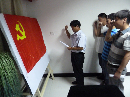 2013年7月10日上午9点30分,水电暖服务中心在中心会议室举行了新党员入党宣誓仪式,此次宣誓仪式邀请了后勤党委书记陈作珊同志,后勤党委委员、副处长、副总经理陈军涛同志、金峰同志,后勤党委秘书韩舒同志出席,中心全体党员,部分入党积极分子参加了此次活动,仪式由水电暖服务中心党支部书记韩百召主持。
