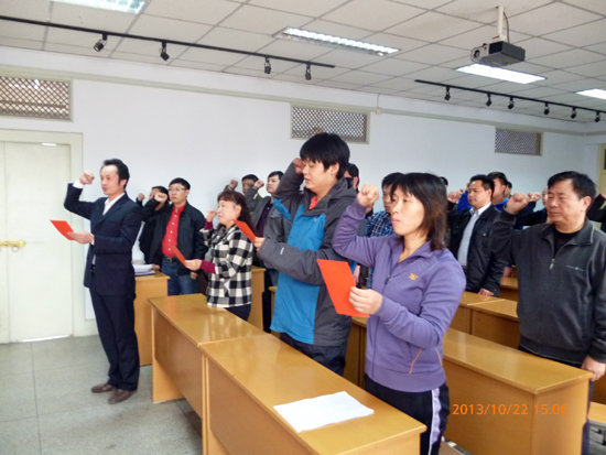 大会伊始,全体起立奏国际歌。后勤党委委员、后勤管理处副处长、后勤服务集团副总经理陈军涛致词,对党员提出要求:要树立形象,认清位置;要牢记宗旨,发挥模范带头作用;要加强理论学习,不断提高个人修养。接着又宣读了新党员发展名单。新党员和全体党员起立面对党旗,由教学办公楼服务中心党支部书记王志宏带领,进行入党宣誓,宣誓过程庄严凝重,誓词代表了全体党员对党最忠诚的决心。学生公寓服务中心刘营花代表新党员发言,决心加强政治理论学习,坚定政治信仰;努力学习业务知识,增强为师生服务的本领;立足本职岗位,创先争优做表率。后勤党委委员、后勤管理处副处长、后勤服务集团副总经理金峰给新党员提出了三点期望:一、进一步加强理论学习,不断提高政治理论素养;二、加强党性锻炼和修养,努力从思想上入党;三、高标准严要求,发挥起共产党员的先锋模范作用。大会在庄严的国歌声中结束。