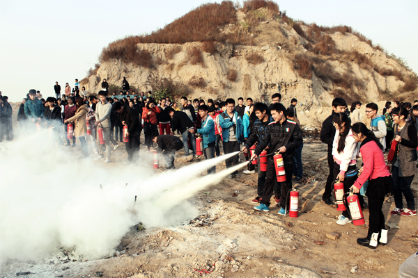 下午三点半,演习活动在东校区操场旁的空地准时开始。工作人员现场模拟了三个“火场”,同时,消防科吴科长向参加演习的师生进行了简要的校园消防技能培训,重点介绍了干粉灭火器使用方法,并在现场进行演示。随后的消防灭火演习中,老师和同学们一起按照灭火的步骤和方法成功扑灭了“大火”。 最后,大家在淡淡烟雾中结束了这次紧张、严肃而又活泼的消防演习。