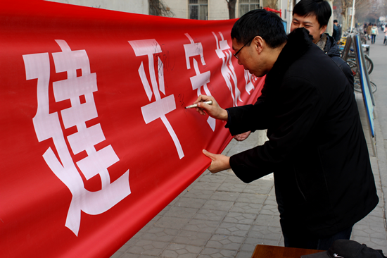 冬季是火灾多发、消防工作的重点时期。为保证学生公寓安全,宣传防火防灾知识,提高同学们的防火安全意识,学生公寓服务中心组织了此次签名活动。广大师生们积极参与,在印有“远离违章电器创建平安校园”口号的红色条幅上签下了自己的名字,显示出对安全防范工作的重视与关心,也表达了将防火防灾行动进行到底的决心与信心。此外,中心职工还在不断的进行校园消防知识的宣传,介绍了火灾预防的重要性,并教授同学们如何做好预防工作,以及在火灾中应如何自卫和保护他人即财产的安全。