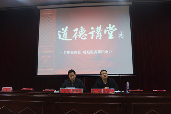 本期道德讲堂以“读经典,看后勤”为主题,主要分为7个环节。在自我反省的环节三省吾身,在学唱《公民道德歌》中涤荡心灵。活动特别邀请了我校文学院副教授陈鹏博士作了《从四大名著看后勤》的学术报告。他从中国的四大名著里的人物讲起,深入剖析了柴进、宋清、荀彧、沙僧、王熙凤的后勤角色和成败得失。他的讲座观点鲜明,举例准确,诙谐幽默,徐徐道来,让全体后勤员工享受到了一次文学人物与后勤工作相辅相成的学术大餐。后勤管理处、后勤服务集团办公室主任王志宏谈了自己心灵感悟。他列举了后勤职工在坚守工作岗位、资助贫困学生、拾金不昧、助人为乐等方面的先进事迹,让大家看到我们身边的道德模范,进一步阐释了道德就是修养、是信念,是凡人善举,它就在我们的工作生活之中。最后,陈军涛副处长带领大家一起诵读《大学》的部分篇章。