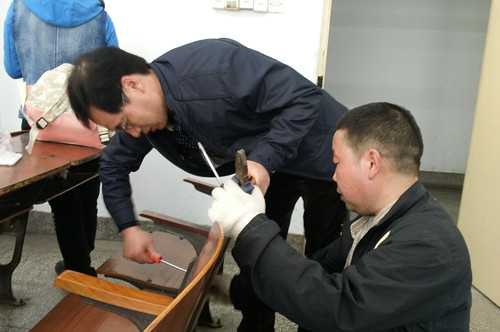 上午8:30,全体志愿者在文科楼集合,教学办公楼服务中心王志宏书记作动员讲话。首先,他向放弃周末休息前来参加活动的志愿者表示感谢,强调教室是一个讲授、传播和学习知识的场所,还是学生收获友谊,交流感情的地方,应当是舒适温馨的,应该受到大家珍惜爱护的,因此,王书记希望大家从我做起,充分发挥螺丝钉精神,为他人、为自己创造一个良好的学习环境。接着,志愿者分为两组分别由赵红胜、赵波带队对教室损坏、松动桌椅进行维修,大家们手拿钳子、螺丝刀等工具勤恳认真,不怕劳苦,时而弯腰检查,时而蹲下维修,甚至连额头的汗珠都来不及擦拭。经过一上午的辛勤劳动,共维修教室17个,加固维修凳子745个、维修桌面267个,教室桌凳在一定程度上有了很大的改善。