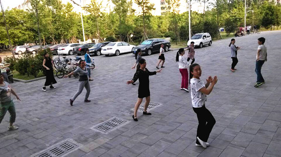 5月18日下午4时,后勤女工在游泳馆东场地学跳了广场舞《小苹果》。