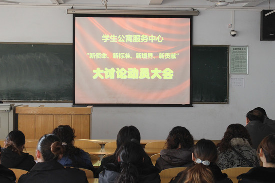 近日,学生公寓服务中心召开了“新使命、新标准、新境界、新贡献”大讨论动员大会。学生公寓服务中心领导班子和全体员工参加了会议,会议由中心党支部书记徐成主持。