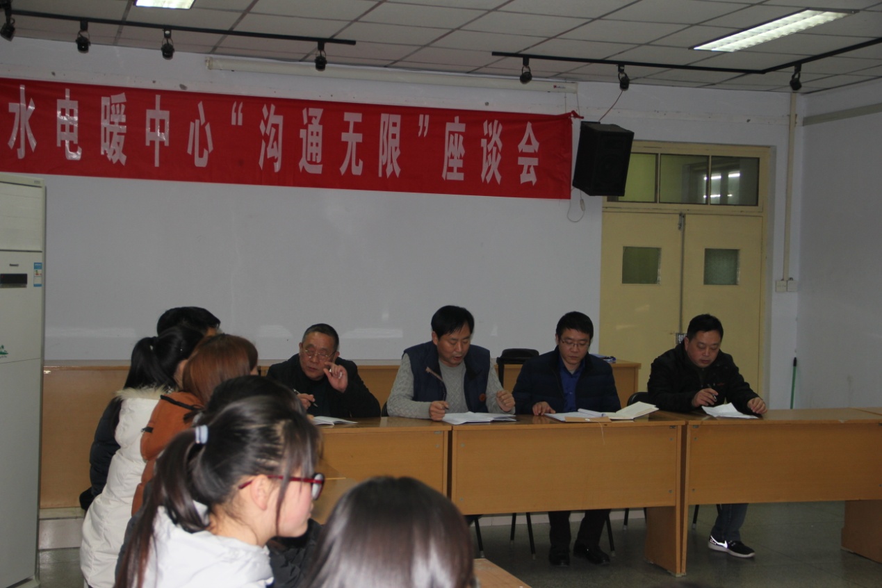 下午5点座谈会正式开始。水电暖服务中心经理向前来参加座谈会的学生表示诚挚的感谢,希望大家通过座谈会能够真正了解水电暖服务中心的服务项目、范围和内容,同时也真诚希望大家对水电暖服务中心的工作提出宝贵的意见和建议。随后同学们就关心问题展开了交流,中心工作人员也就大家提出的问题进行了解答。