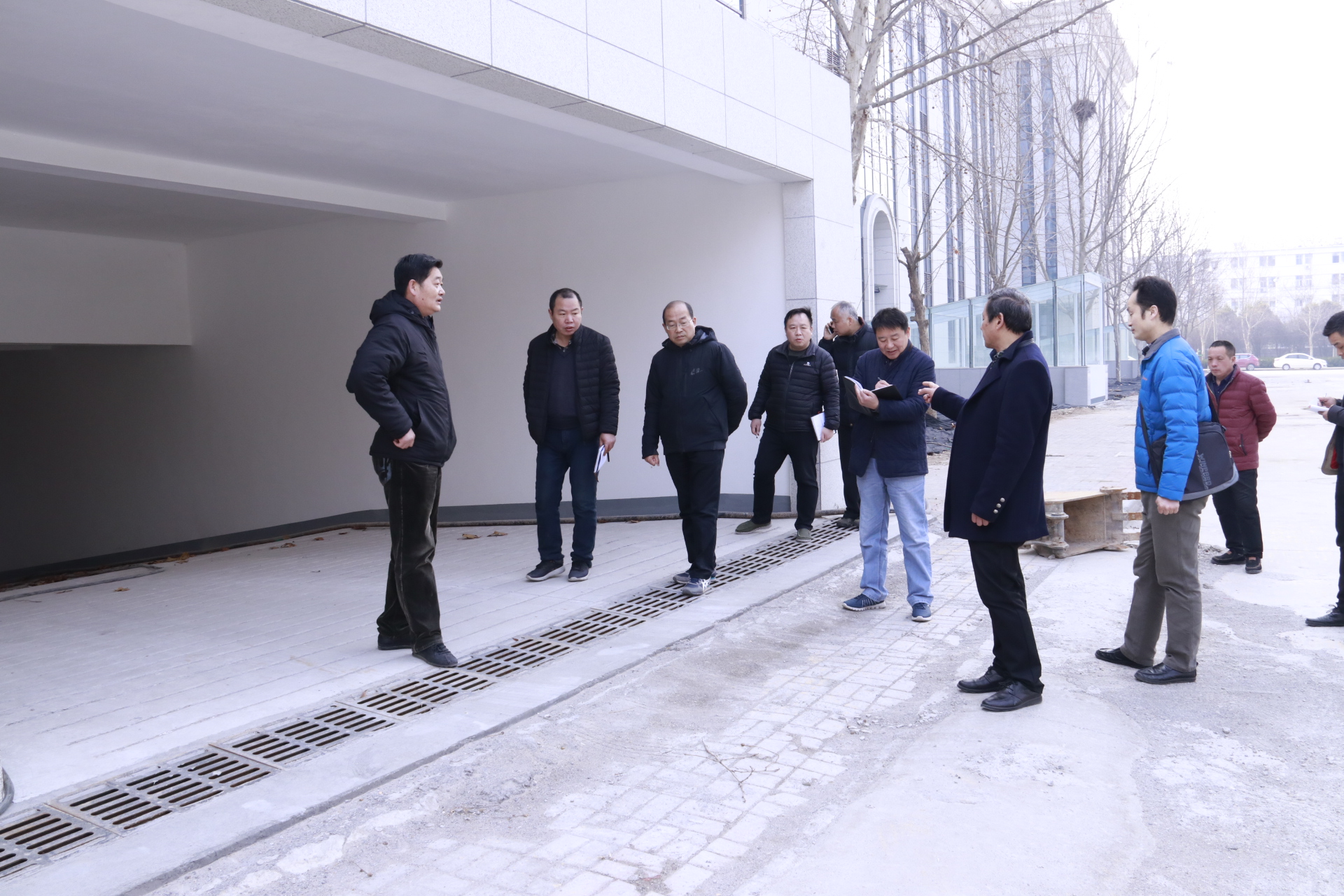 陈俊杰一行首先到东区综合教学楼工地进行调研。大家深入工地现场,围绕教学楼周边道路铺设、环境绿化、水电管网工程等问题展开深入研究,并结合现场情况,制定了具体解决措施。李庆广强调指出,东区综合教学楼项目是我校的重点工程,其建设工作事关我校教育部本科教学审核评估等一系列关系学校长远发展,后勤管理处各部门要高度重视、竭尽全力,保质、保量、按时完成相关配套工作。