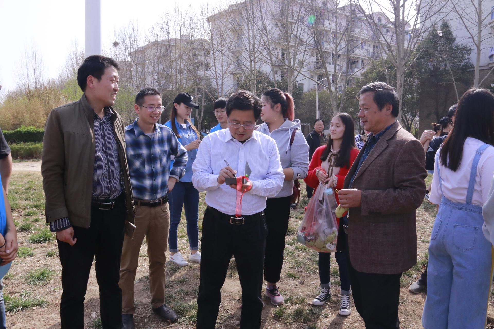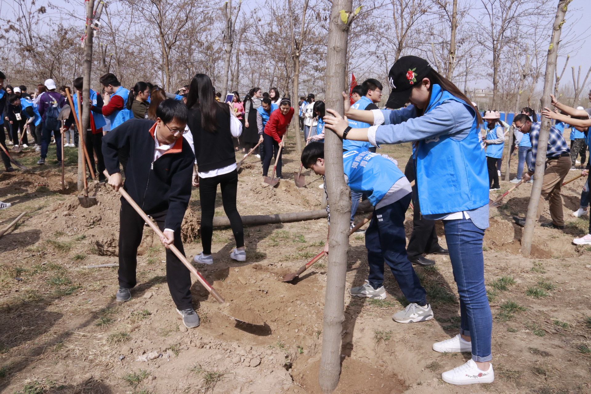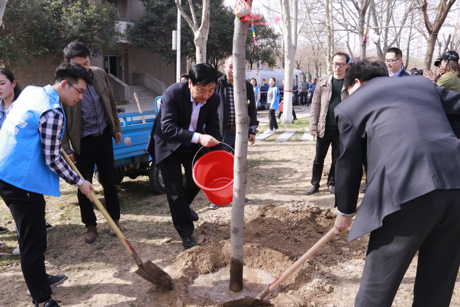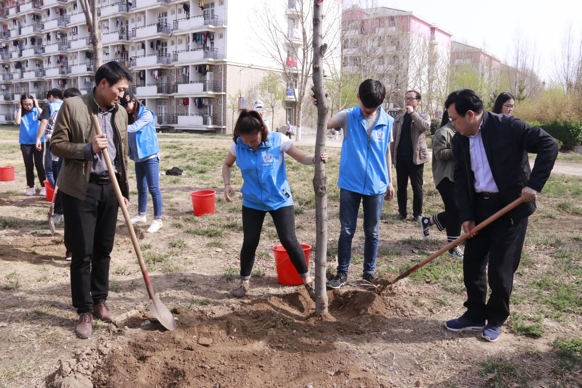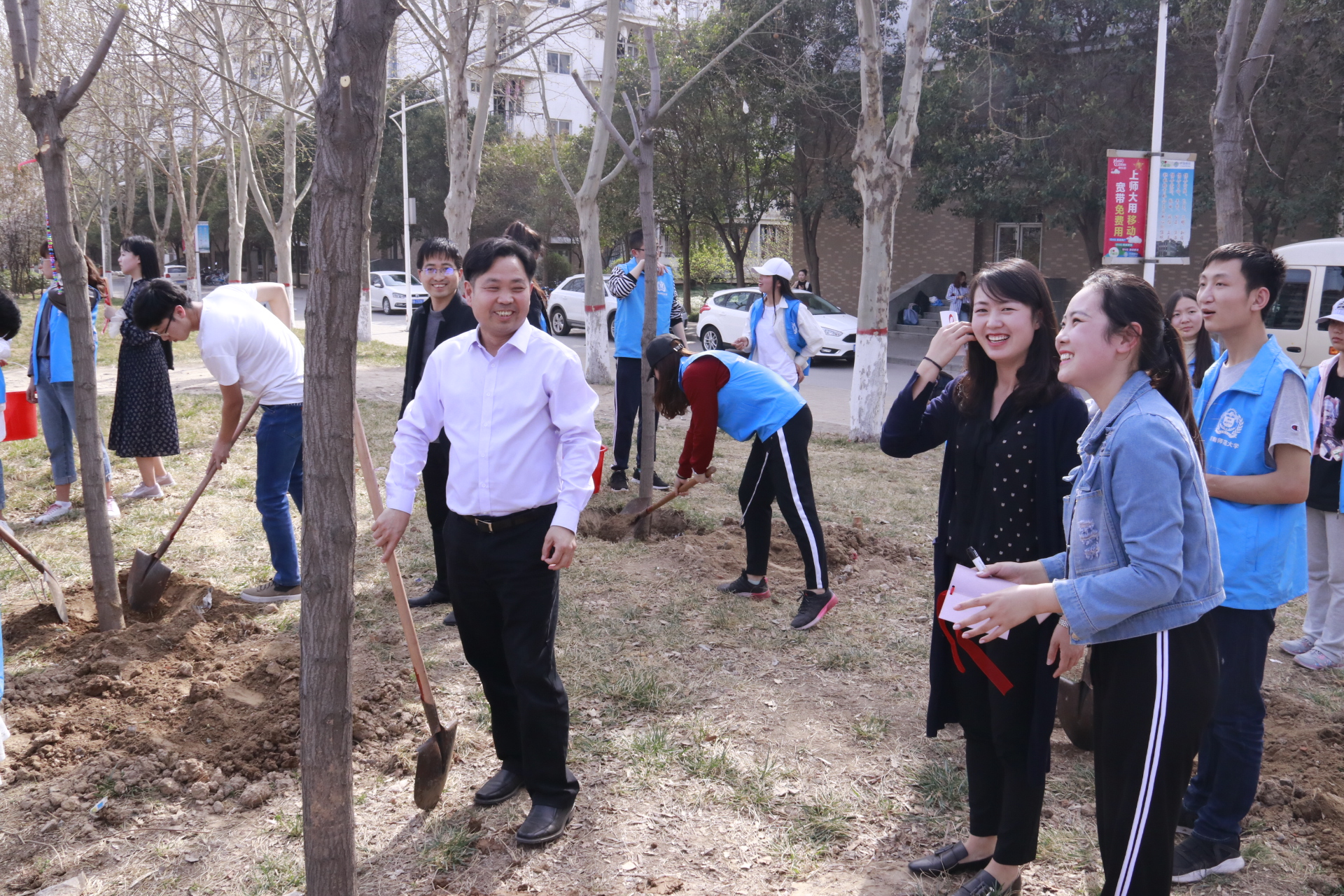 3月27日下午,后勤管理处、后勤服务集团、校团委在东校区组织植树活动。校党委书记赵国祥,党委副书记、工会主席臧振春,党委副书记陈广文,副校长李雪山、刘玉芳,纪委书记张尚字等领导出席活动,并与志愿者一起植树。党委办公室、校长办公室、党委宣传部、学工部、研工部、后勤管理处(后勤服务集团)、校团委等职能部门负责人与全校400多名志愿者共同参加植树活动。
