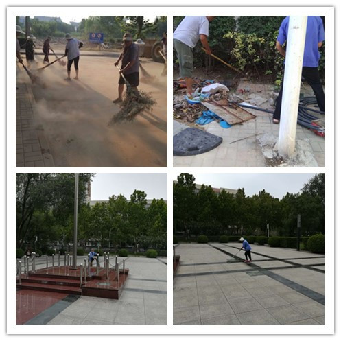 组织人员集中清理东校区综合教学楼周边卫生,对西校区国旗广场进行擦拭和清扫