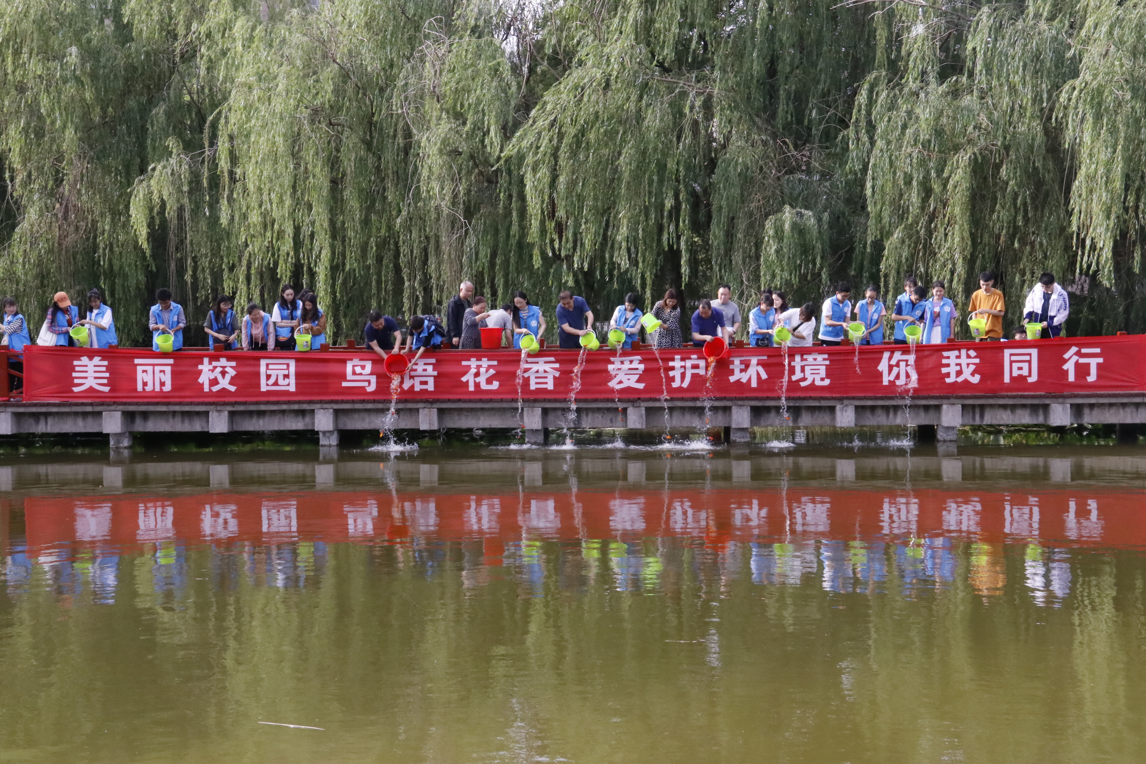 本次主题活动以“同创美丽校园 共享愉(鱼)悦(跃)生活”为主题。活动中,师生一起携手共同投放红草鱼、锦鲤鱼苗共计1500余尾,旨在持续丰富涵养人工湖生态环境,为广大师生营造优美宜居的学习工作环境。之后,师生共同对湖畔花园进行了集中清扫。