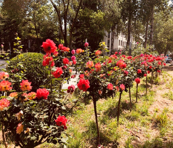 藤本月季属蔷薇亚科藤性灌木,干茎柔软细长呈藤木状或蔓状,可三季开花,且成簇花开放时散发浓香。校园管理中心工作人员将对绿植进行专业的日常维护和管理。