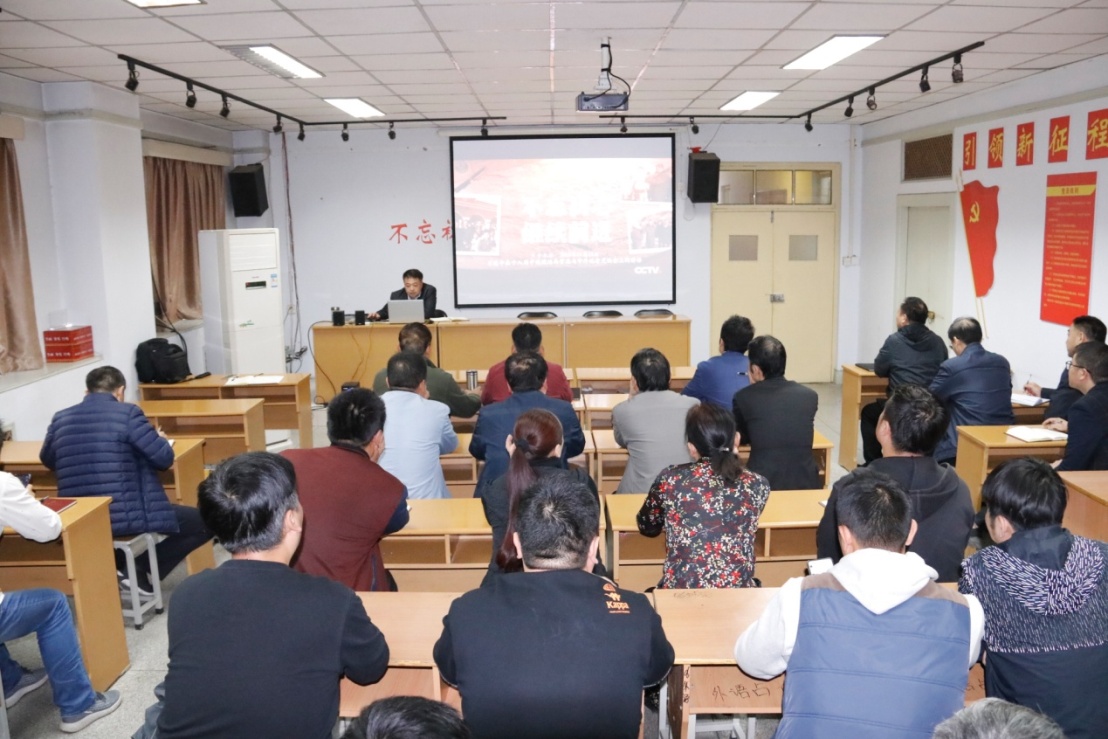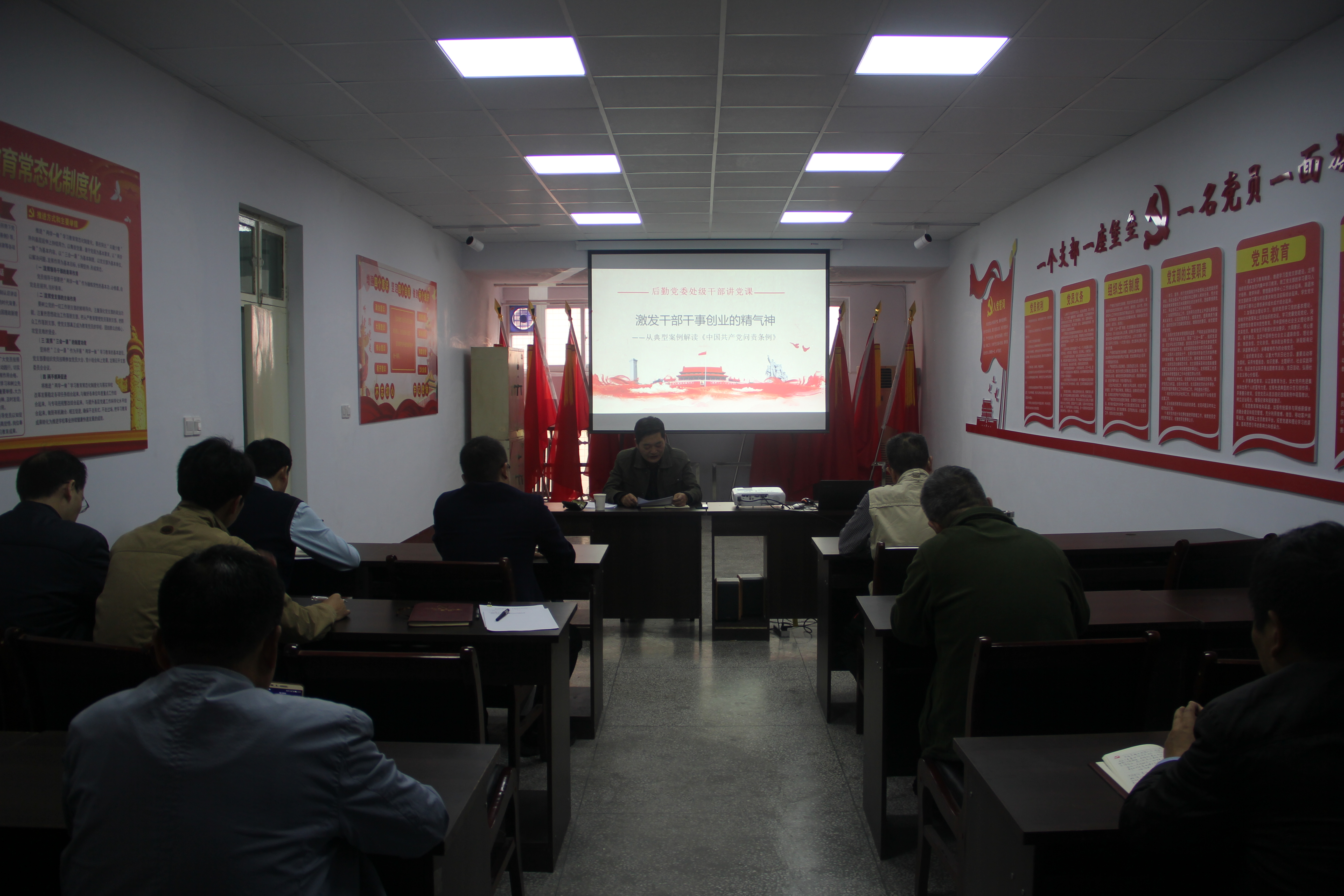 10月15日,后勤管理处处长李庆广在文渊楼5楼会议室为全体党员干部开展干部为职工讲专题党课教育。