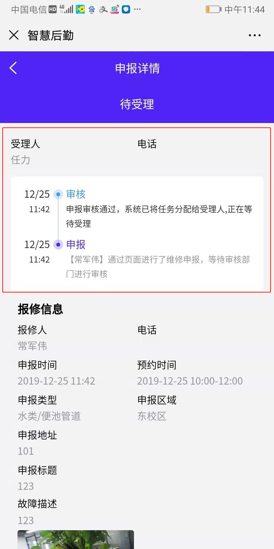 宿舍报修:宿舍有问题需要报修时,可直接在手机端填写需要报修的项目、问题、照片等,提交后,可在线跟踪报修的处理进度,完工后可在线进行评价。