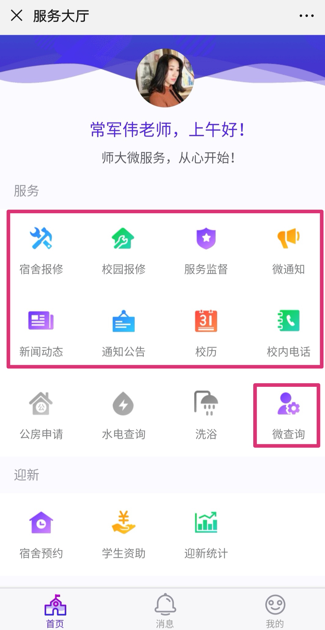 “河南师大微服务”是在“河南师大微服务”公众号一期建设实现宿舍预约、网上迎新等服务基础上进行了服务升级。二期建设目前已经完成,对服务、页面进行了改版,现正式上线试运行。为方便广大师生操作,现介绍如下: