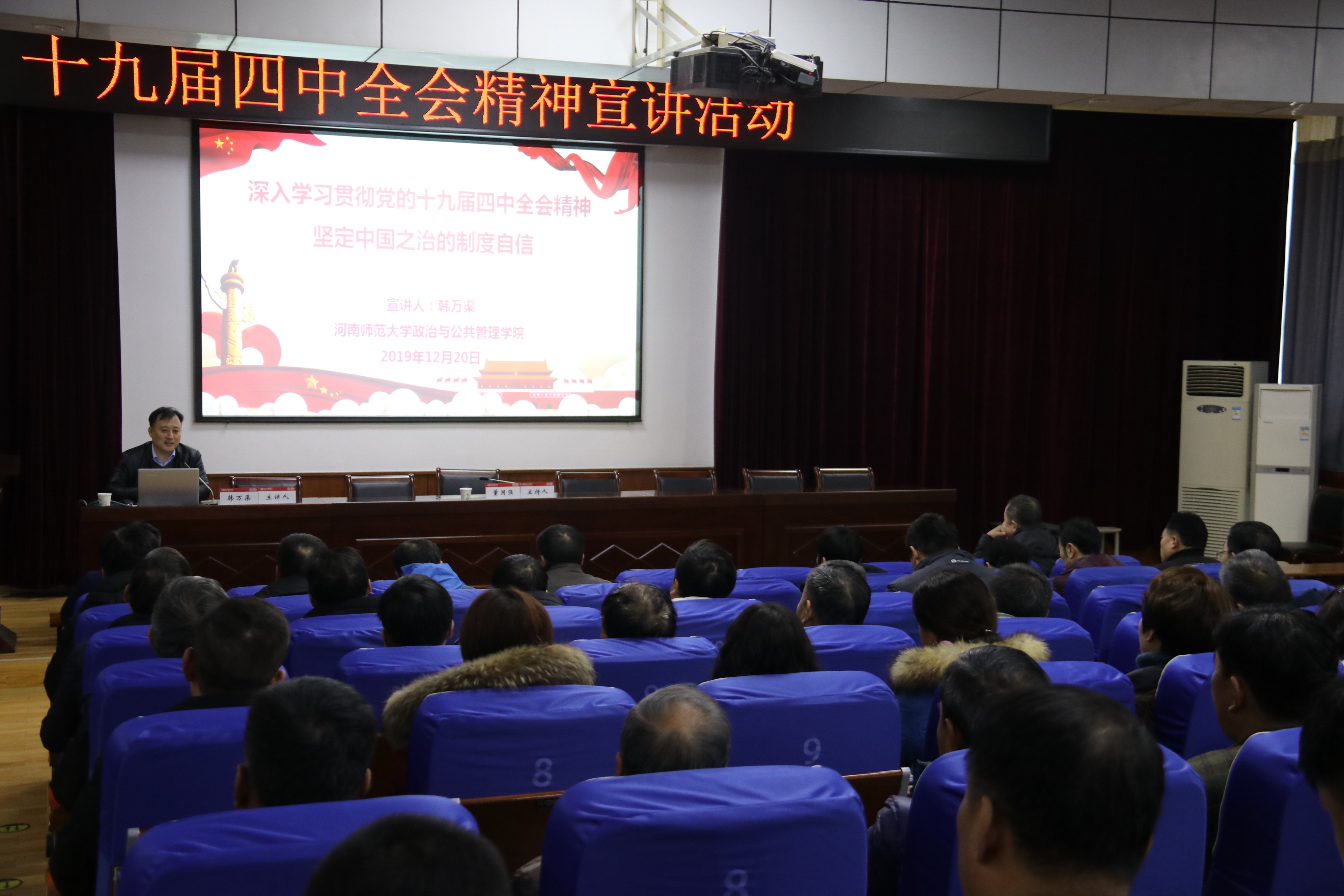宣讲会上,韩万渠以《深入学习党的十九届四中全会精神,坚定中国之治的制度自信》为题,以深刻认识中国特色社会主义制度和国家治理体系的显著优势,准确把握坚持和完善中国特色社会主义制度、推进国家治理体系和治理能力现代化的总体要求、总体目标和重点任务,以高度的思想自觉政治自觉行动自觉贯彻落实好全会精神等方面,对党的十九届四中全会精神进行了系统阐述和深入解读。