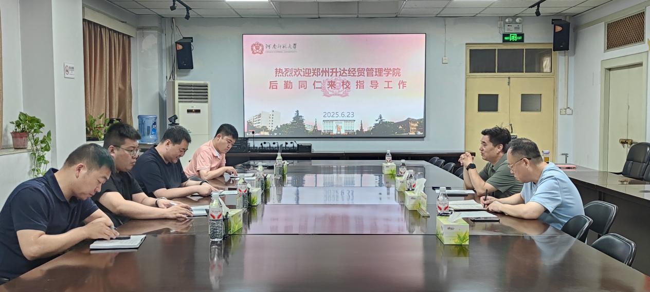 6月23日上午,郑州升达经贸管理学院总务处处长冯亚飞一行四人来我校就餐饮服务管理工作进行调研交流。座谈会在文渊楼529会议室举行。