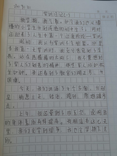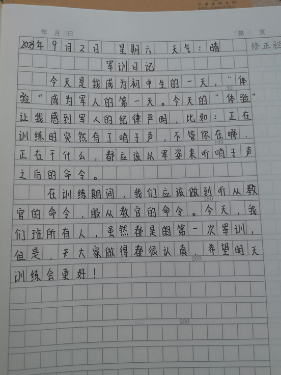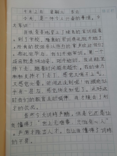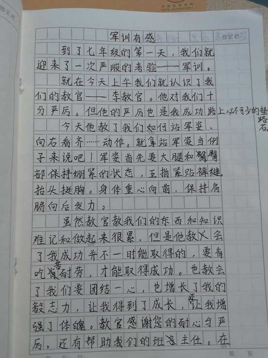 学有所思,方有所长。在任何学习活动中,及时的反思都是必不可少的。学生们经过前一天的训练,感悟颇深,纷纷提笔下字,写下内心所想。从学生的文字中,我们看到了其坚韧不拔之意志、乐观向上之心态、知恩必报之情操、虚心好学之精神。我们相信,经过此次的军事训练,我们的孩子的心态心理、精神面貌等,都能够更上一层楼!