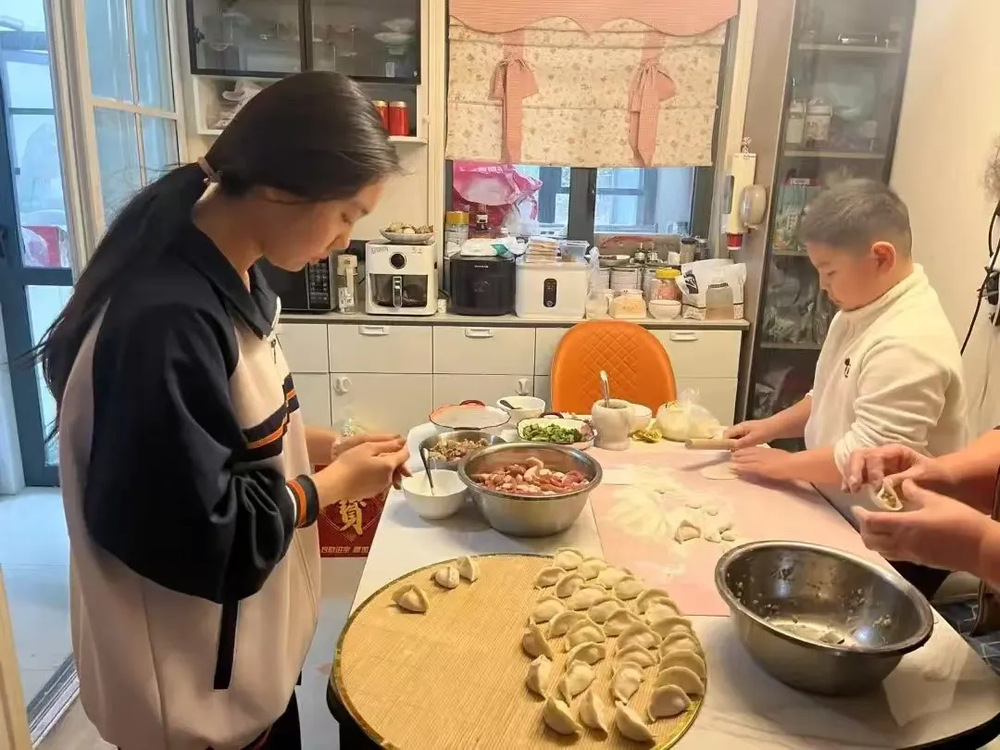 年夜饭,也被称为“团年饭”,一年一度的团圆饭,体现了家庭成员的互敬互爱,也是家家户户最热闹的时候。春节期间,学生们身体力行,帮家人一起制作美食,阖家欢乐。