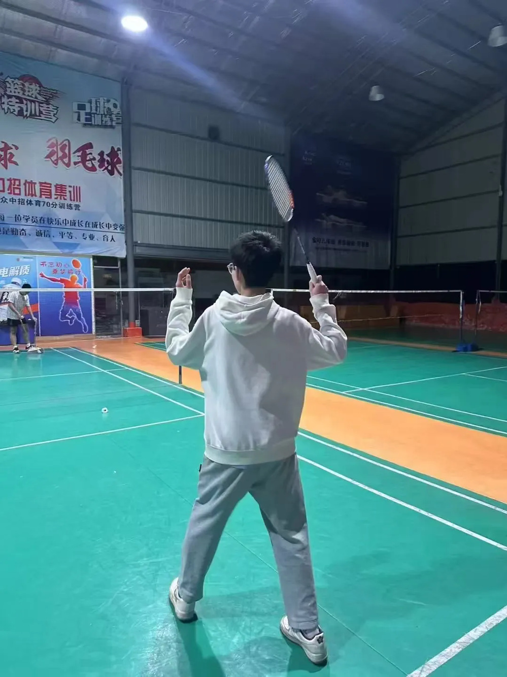 羽毛球场上,羽毛球在空中划出一道道优美的弧线,同学们灵活地移动脚步,高高跃起扣杀,尽显青春活力。
