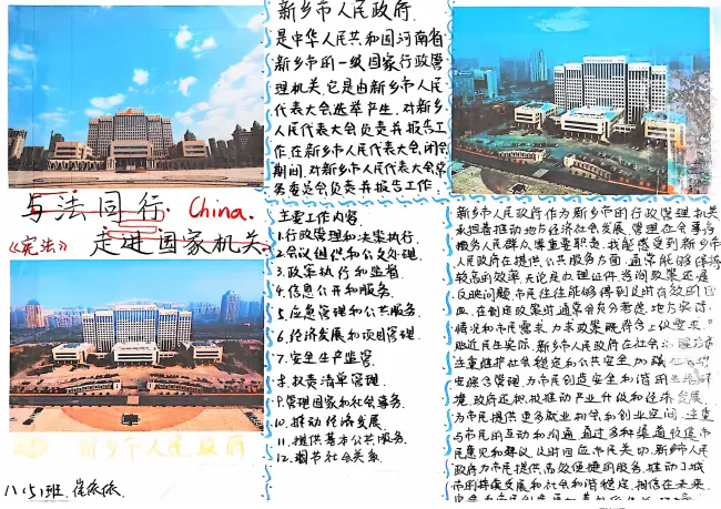 为了强化学生对于国家机构设置的认识,从而深入了解全面依法治国的总方略,加强学生的法治意识,政治学科给同学们布置了一项特色作业:从政府官方网站了解有关国家机构的知识,选出自己感兴趣的某个部门,制作一幅手抄报。同学们非常重视,积极参与,展示出一幅幅精美且专业的法治手抄报。