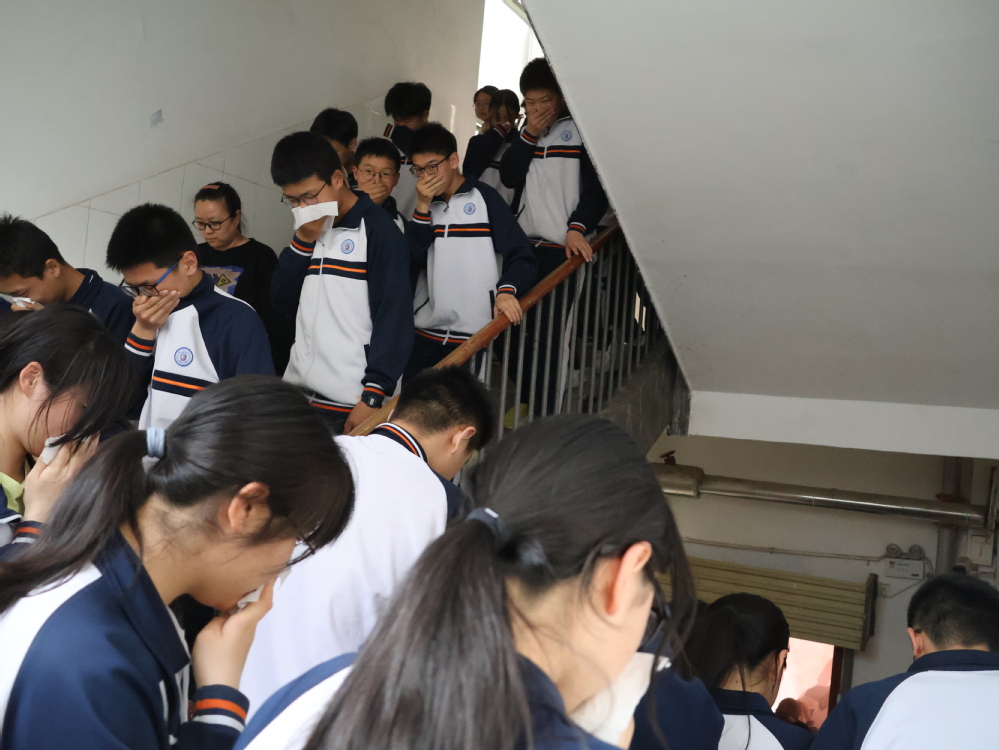下午四点十分,随着学校的警报声骤然响起,各班班主任依据学校制定的应急预案,迅速组织学生展开疏散行动。学生们猫腰掩鼻,严格按照规划的应急疏散通道,以迅捷而有序的步伐撤离教学楼,整个场景紧张而有序。