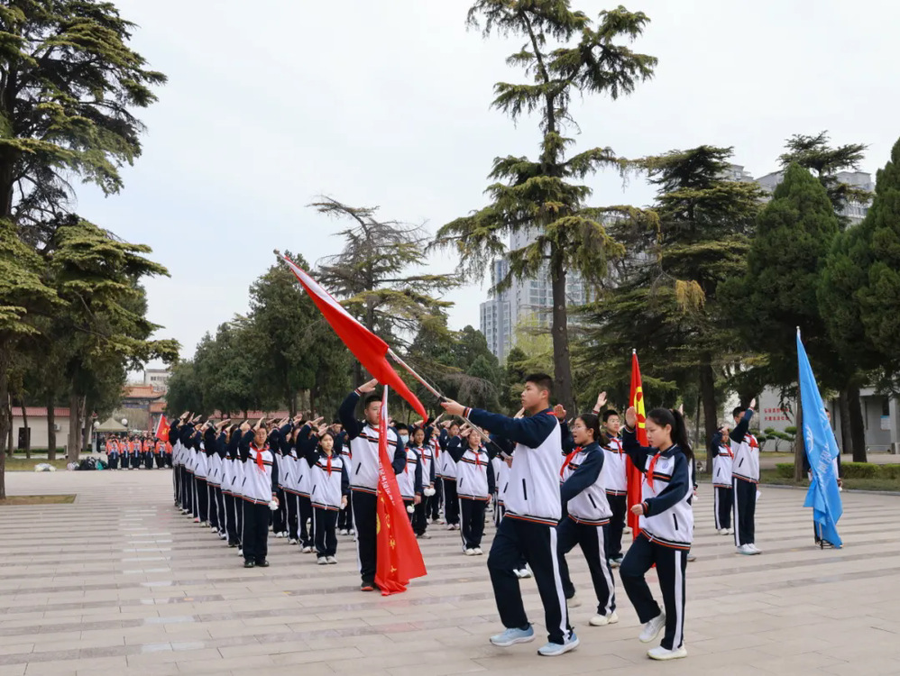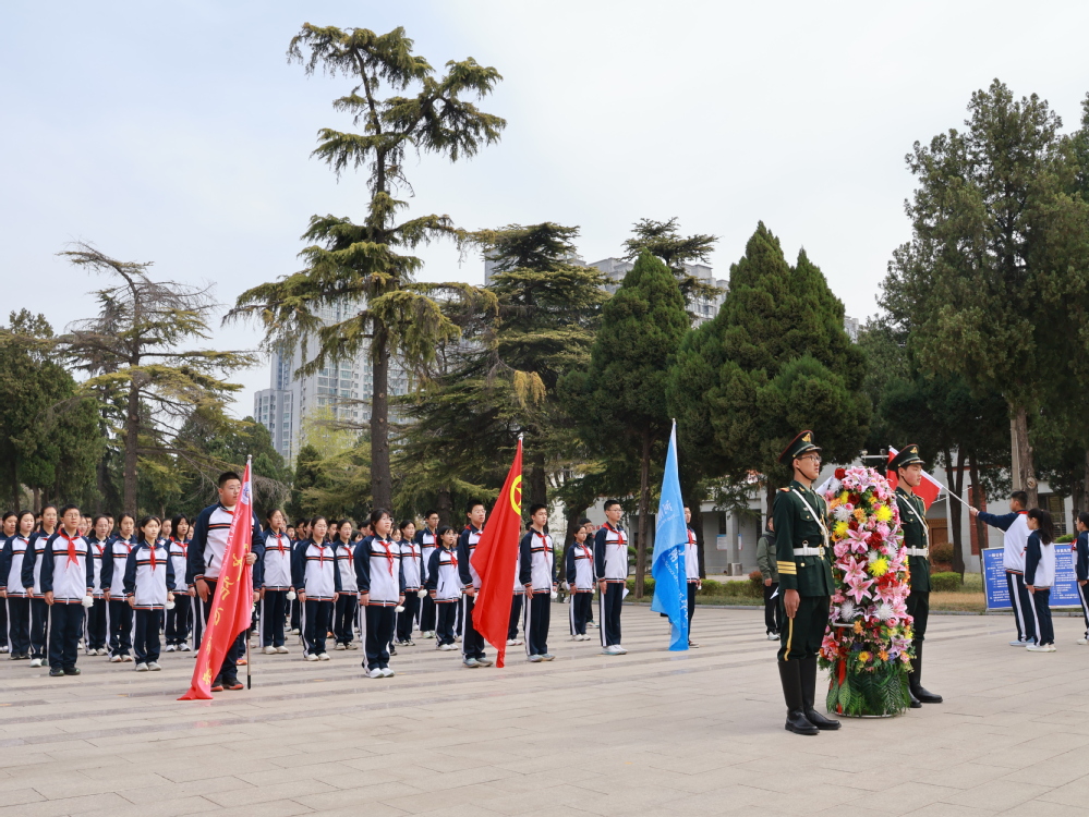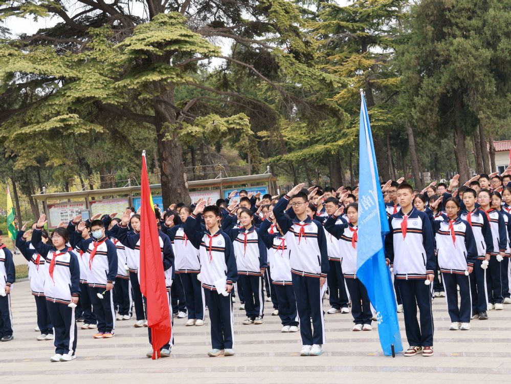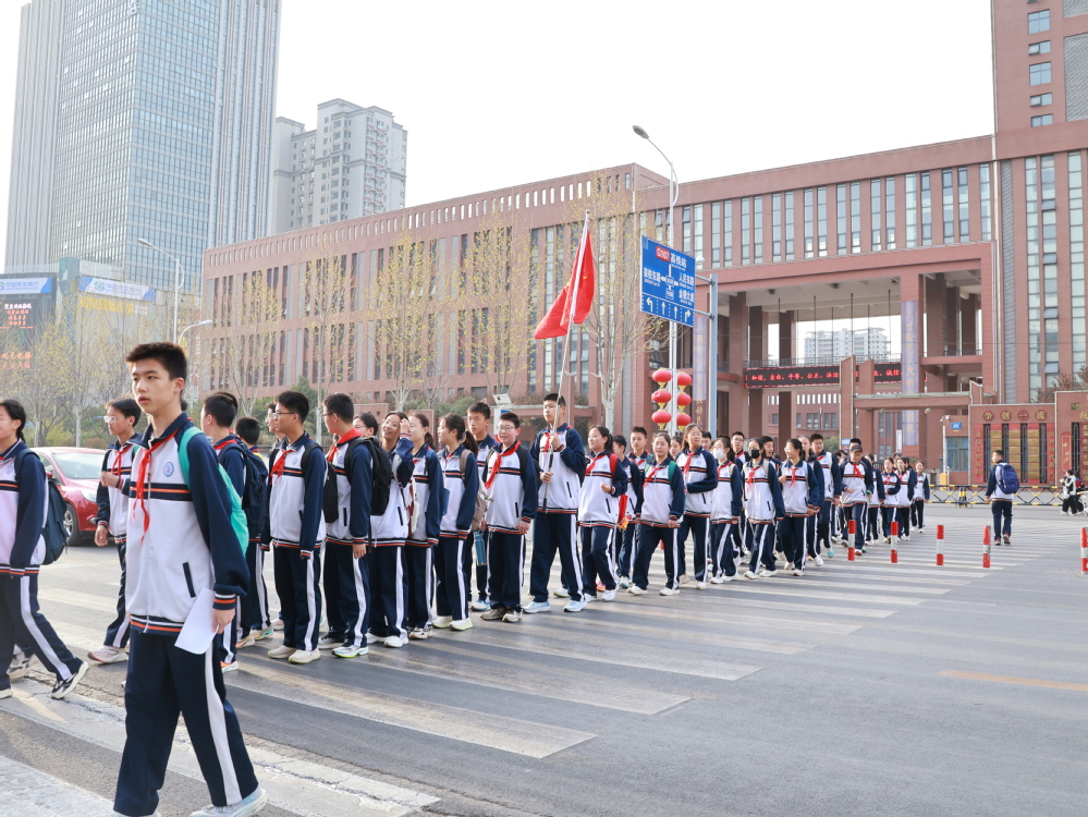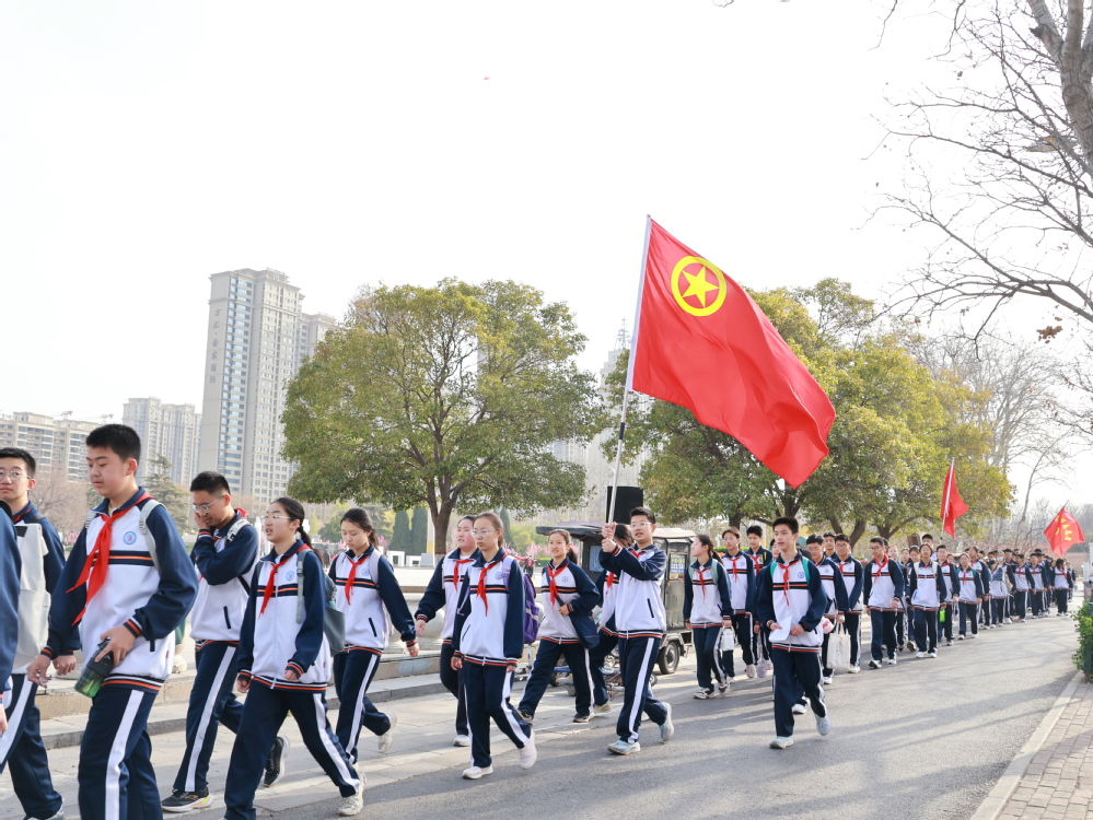 清晨,同学们在教学楼前集合,整装待发。随后,正式踏上了前往新乡市烈士陵园的道路。一路上,同学们高举旗帜,精神抖擞,充分展示了我校学子的良好风貌。