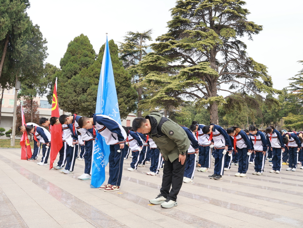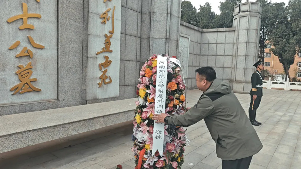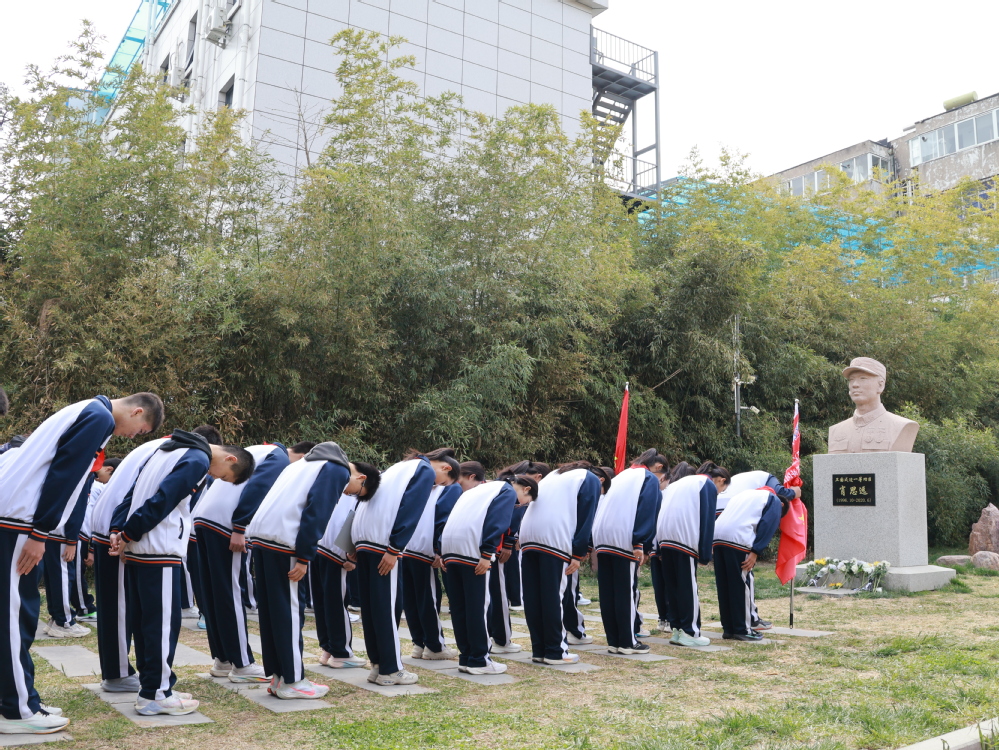 学生代表向烈士敬献花篮,赵文鹤主任上前整理挽联,全体师生向烈士行三鞠躬礼。
